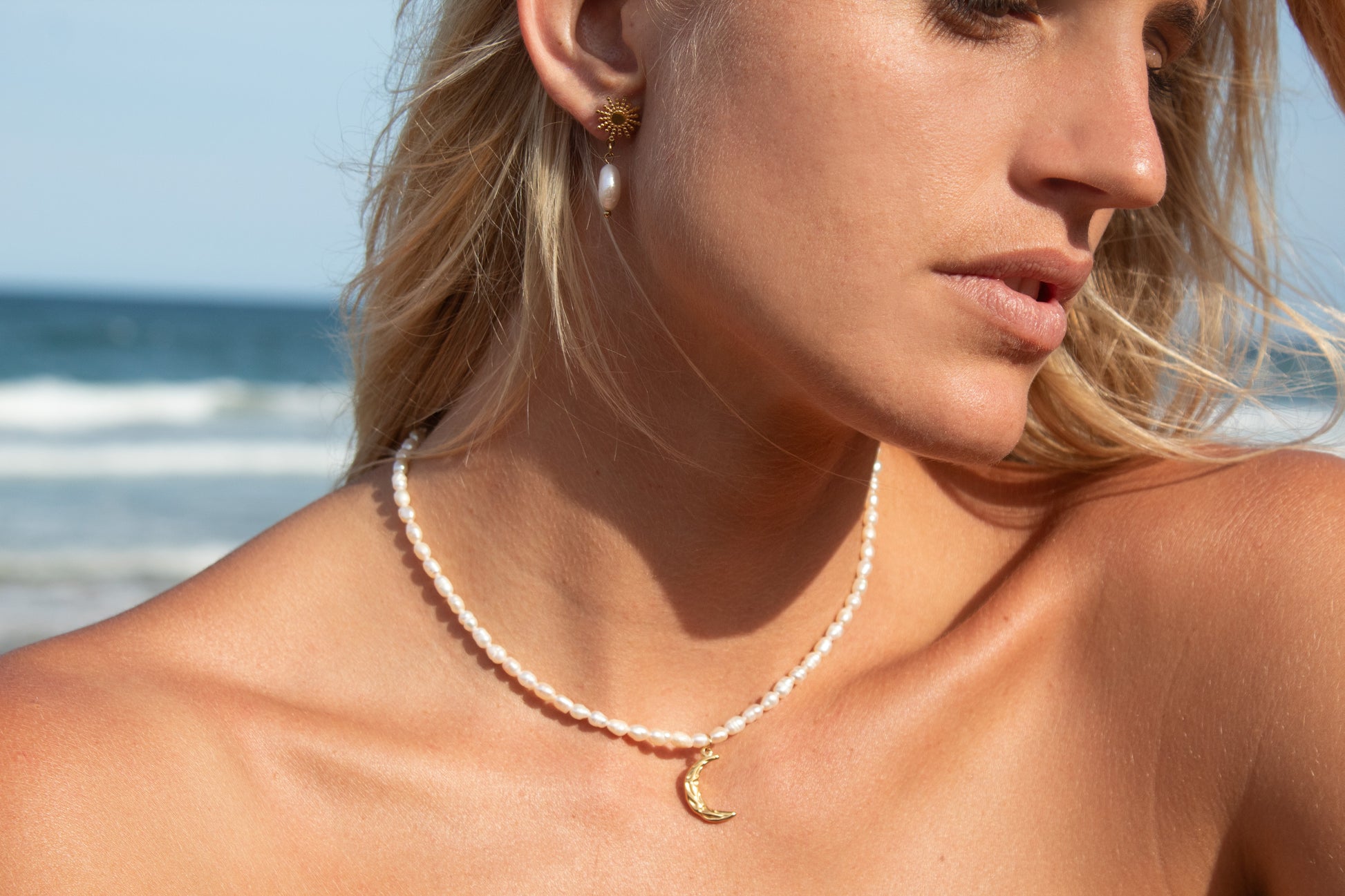 Inspired by moonlit skies and ocean tides, the Lunar Pearl Necklace carries the quiet magic of the night. A luminous set of stack of pearls echo the moon’s gentle glow.